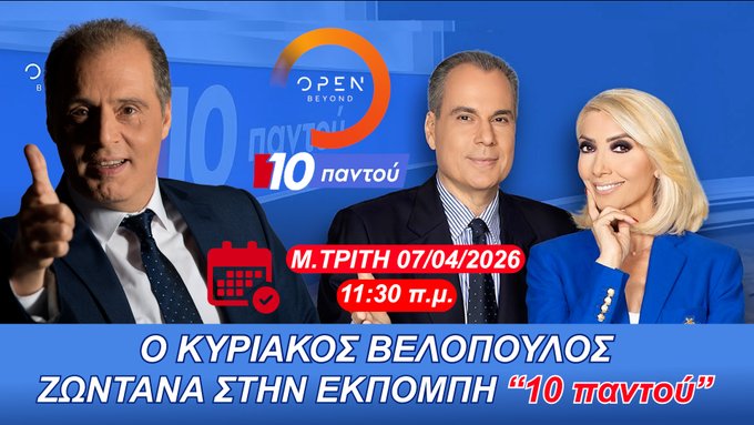 Αύριο Μεγάλη Τρίτη 07 Απριλίου 2026 στις 11:30 π.μ. ο πρόεδρος της Ελληνικής Λύσης Κυριάκος Βελόπουλος θα είναι στο opentvκαι στην εκπομπή #10Παντού με...